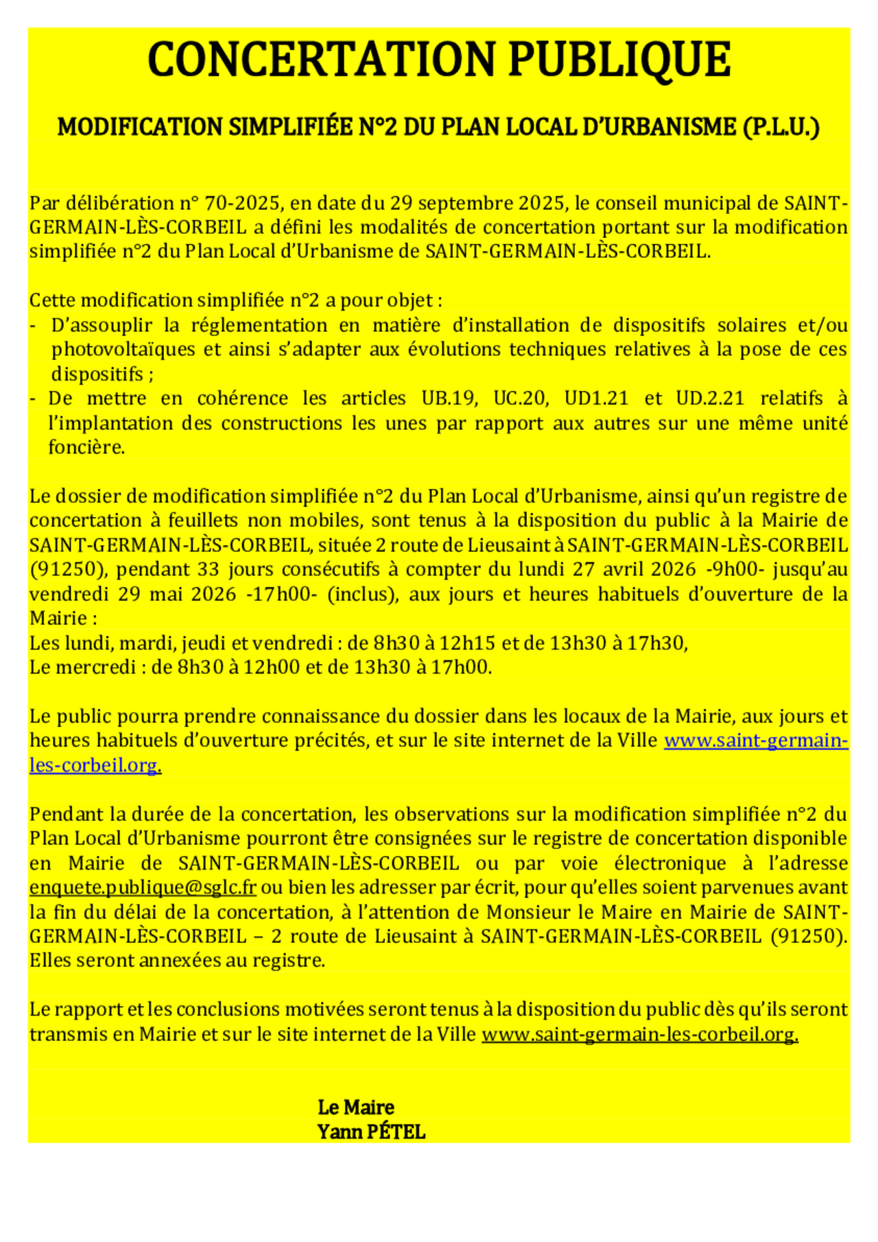 Dans le cadre de la modification simplifiée n°2 du Plan Local d'Urbanisme, une concertation publique est ouverte du lundi 27 avril au vendredi 29 mai 2026.