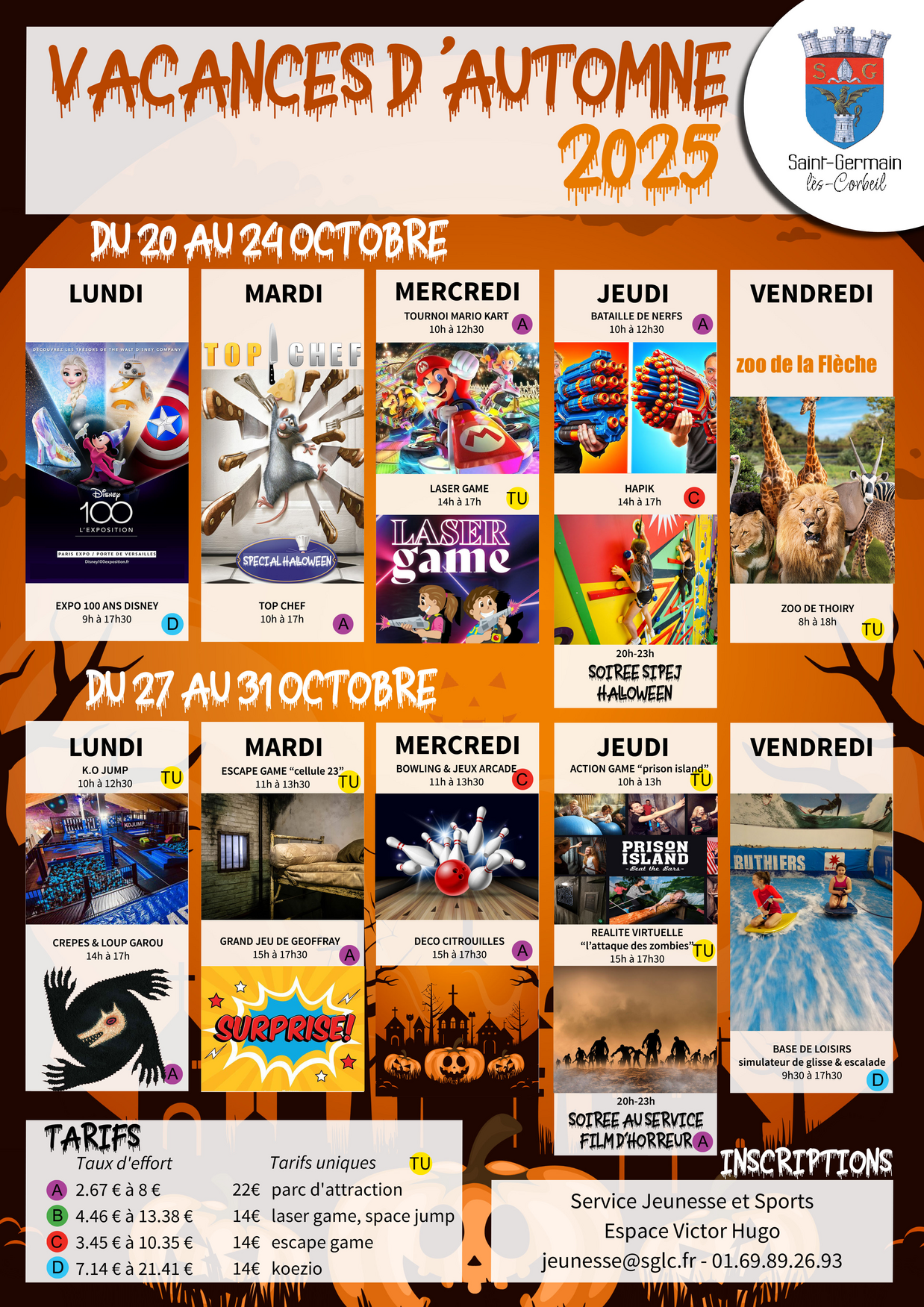 Les activités, les séjours... Sommaire Fiches d'inscription et fiche sanitaire Programme des vacances Les sorties trimestrielles Fiches d'inscription et fiche sanitaire Fiche Sanitaire 2025-2026 PDF 132 Ko Fiche d'inscription - Programme des vacances - Octobre 2025 PDF 628 Ko Fiche d'inscription - Escape Game - Novembre 2025 PDF 104 Ko Programme des vacances Du 20 au 24 et 27 au 31 octobre Les sorties trimestrielles Sortie Escape Game - Novembre 2025